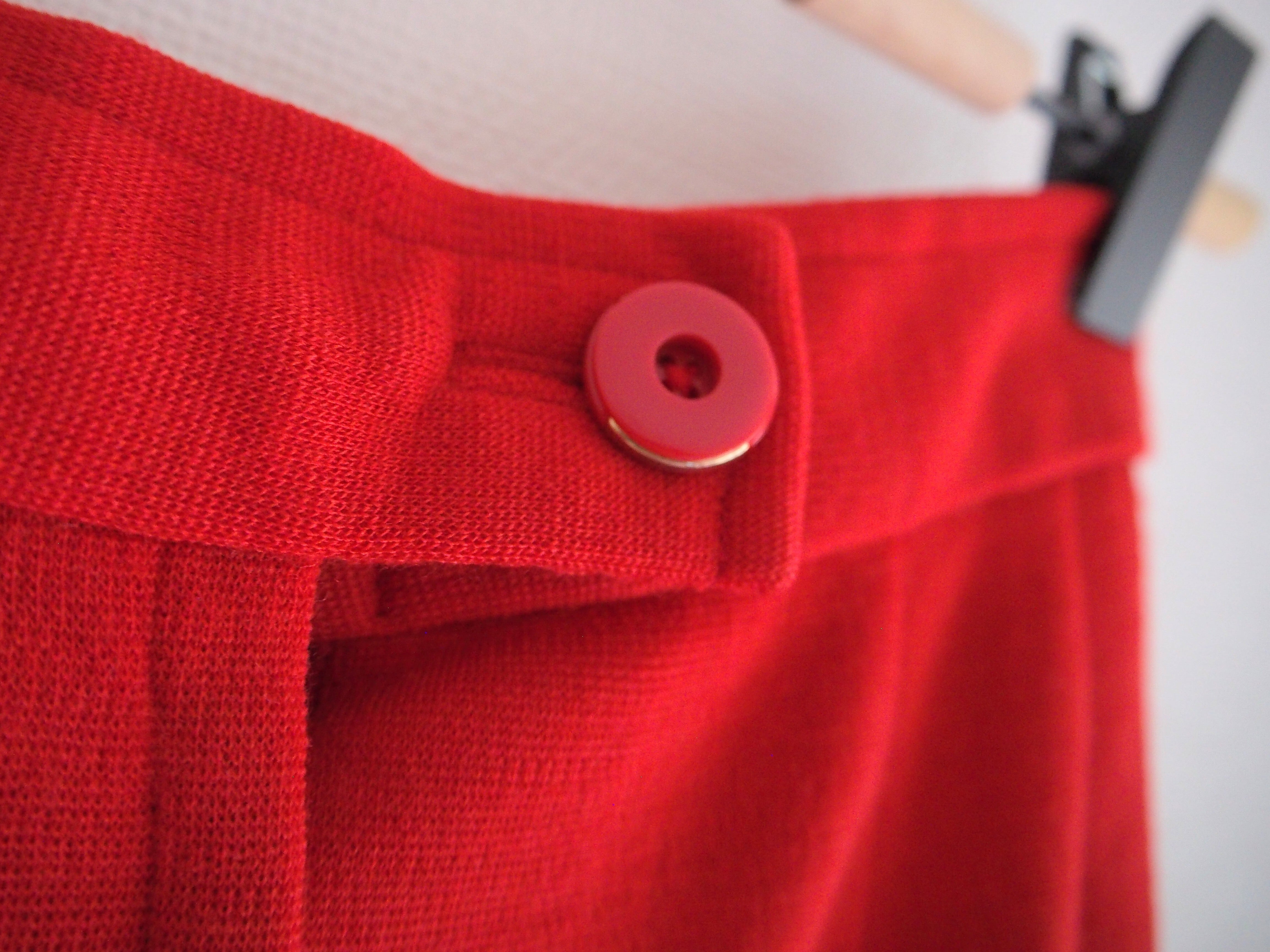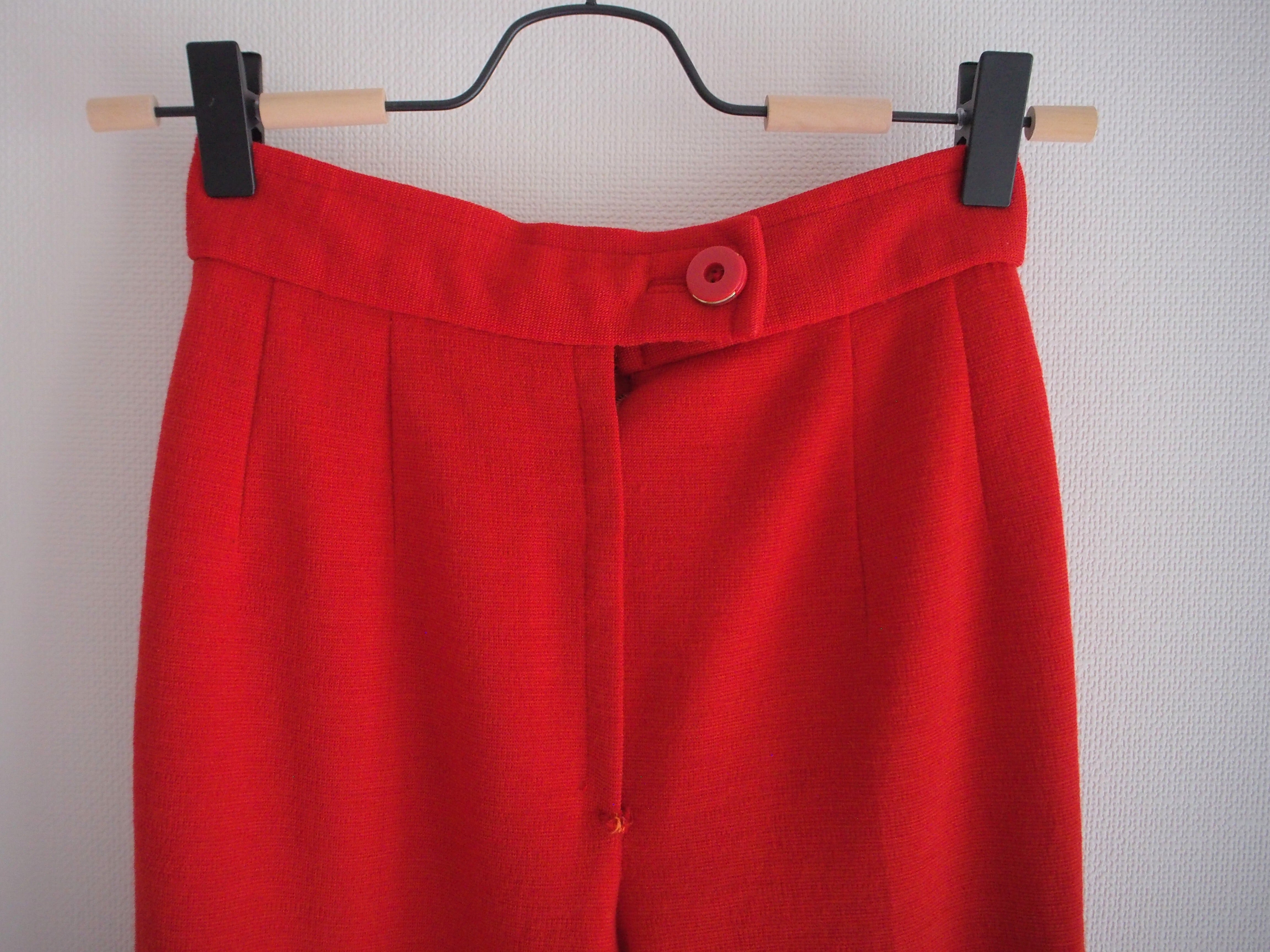 真っ赤な丈長めのパンツ。少しフレアなシルエットです。